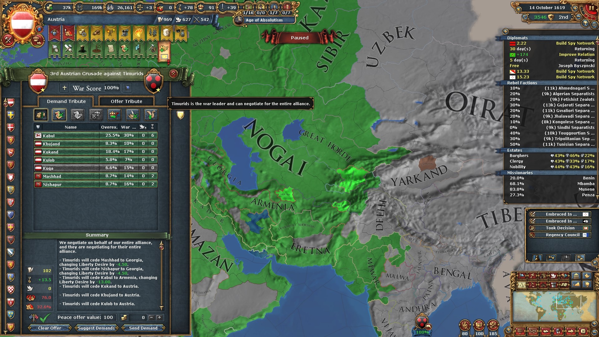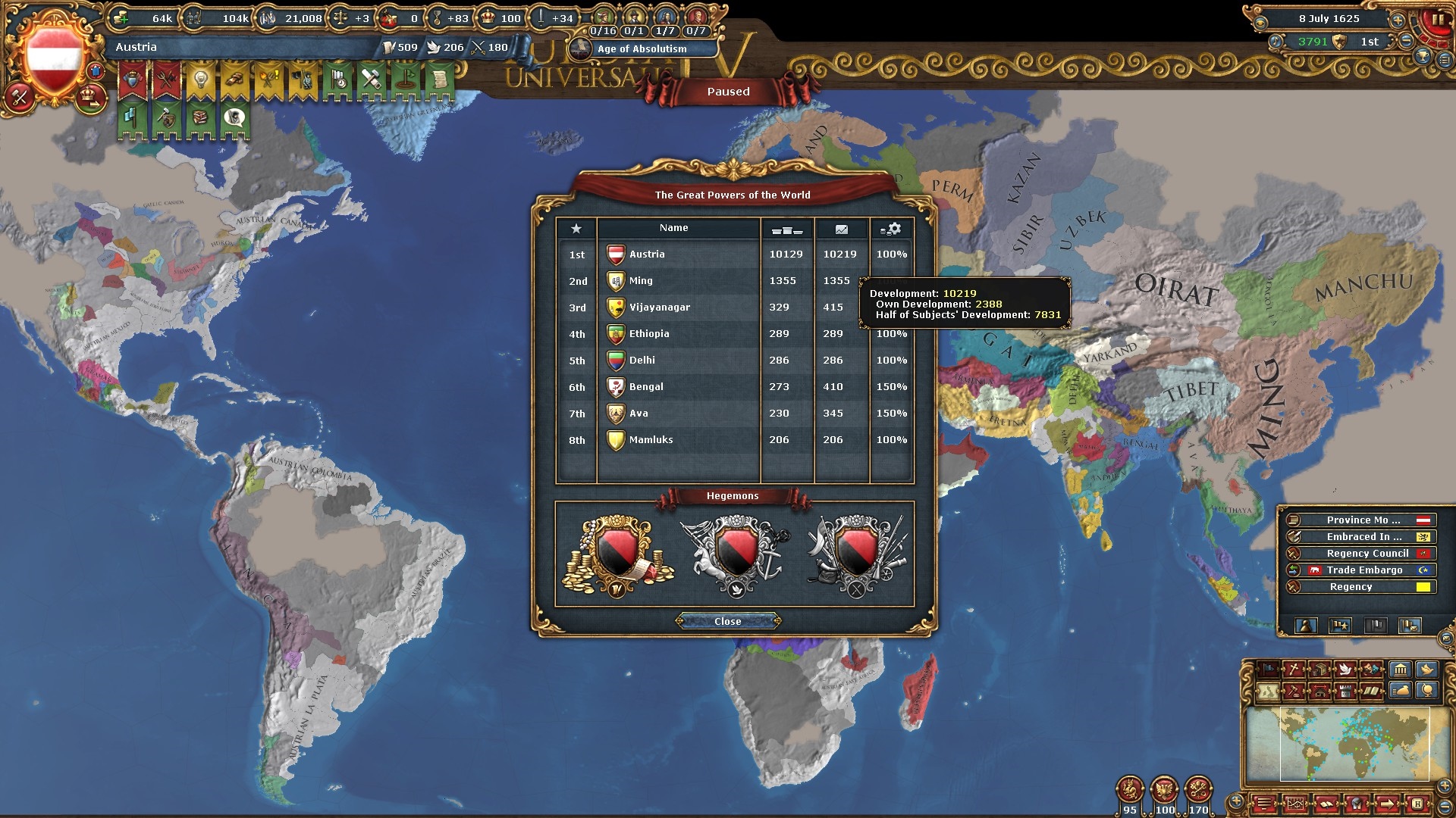 ファンネルプレイでは属国に領土をほとんど投げているので自治領の割合が低いままです。