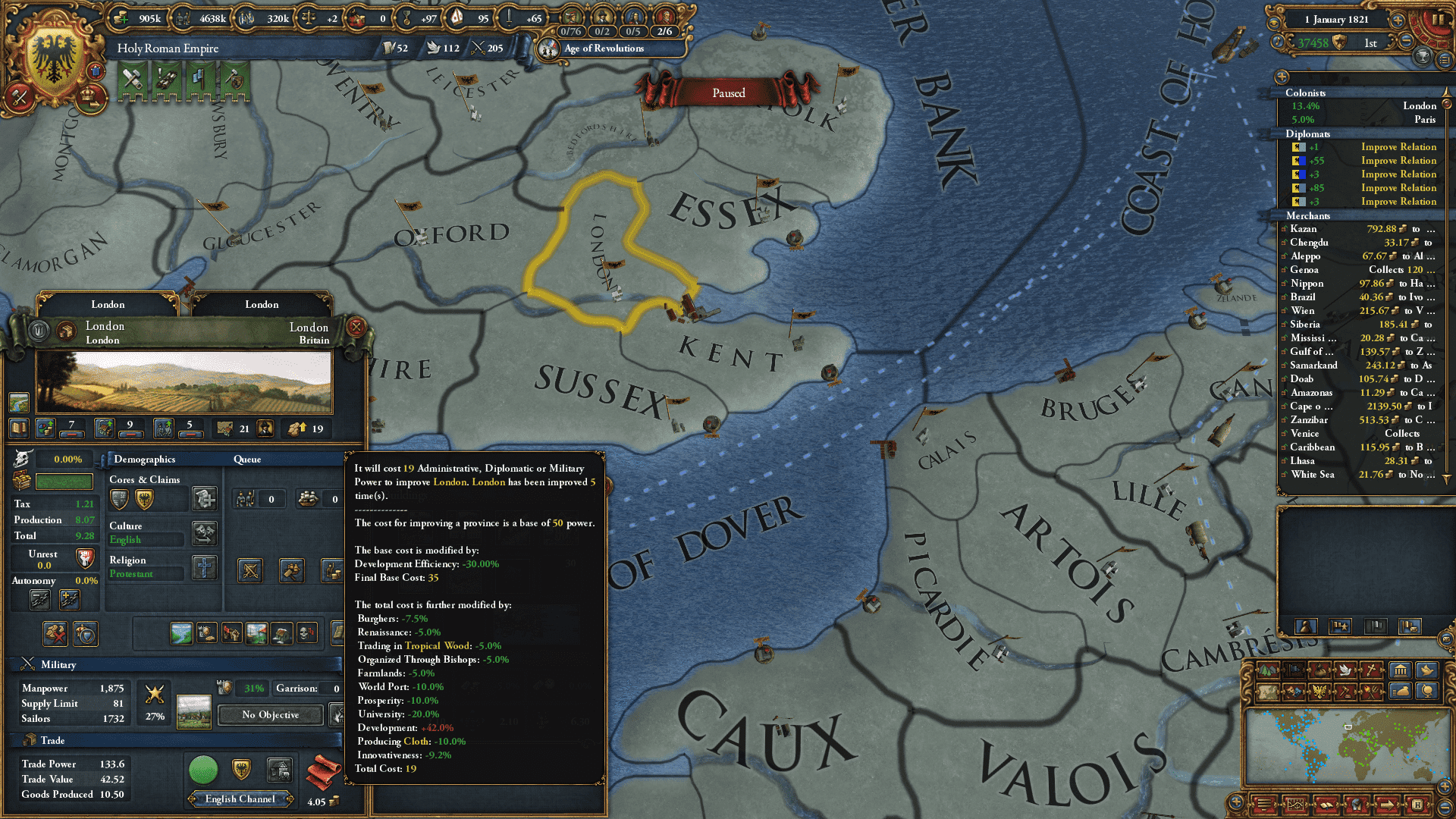 植民地国家との交易効率の比較時に気付いたが、外交技術Lv32だと技術先行ボーナスで交易効率+20%がついたらしい