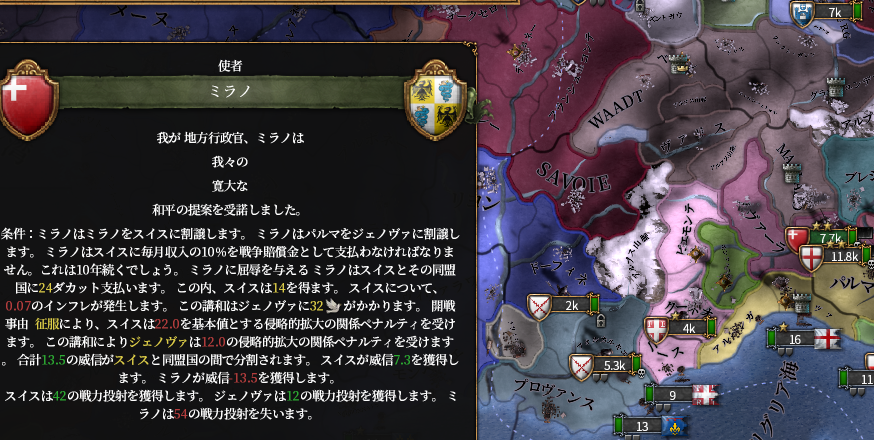 首都ミラノを奪いました。ジェノヴァにはパルマをあげています。