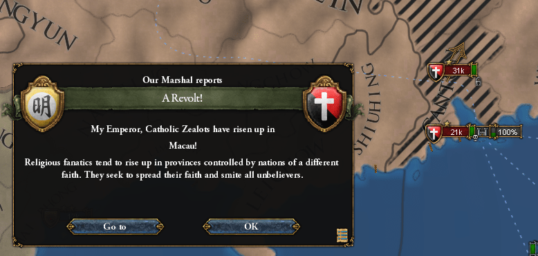 g.png それがじゃな、第3章で得意顔で紹介した「Catholic Zealotsを生成する方法」がなぜか使えなくなっての。何をしてもQi Separatistが消えなくなりおった・・・リセマラの中では1550年代まで行っても解決できなかったこともあったんじゃ。仕方がないのでOpen China系列イベント第四弾の発動を待つことに・・・