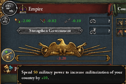 t.png 軍事点50消費して10%ずつ上昇し、100%になれば規律+10%などの恐ろしい効果が得られるってやつだな。試しに一回・・・って、増減が毎月-3.2!?(普魯士(プロイセン)変態時)
