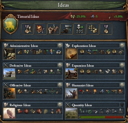 統治系アイデアをいっぱい取りたかったので、なるべくコア化を選ばず、外交併合を使っていたが、ティムールのメリットである、コア化が容易+征服地の反乱確率が低い、という点を活かすならもっと併合を選べばよかったのかも?