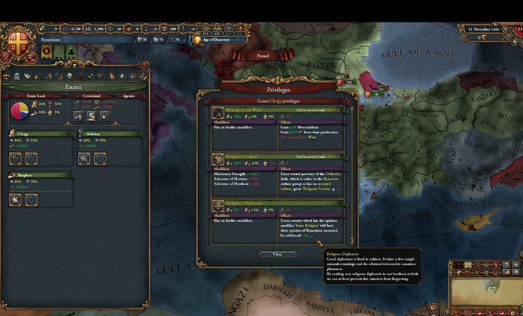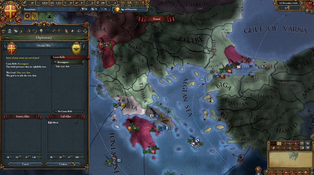 画像はビザンツのFLが14、同盟はオーストリアとリトアニア、オーストリア-ハンガリーの同君連合が成立しており、オスマンがマムルークと戦争している状況です。リサイズにより見づらくなっていますが、戦力はビザンツ側が歩兵71K騎兵14K、オスマン側が歩兵38K騎兵7Kです。これくらいあると非常に理想的ですが、オーストリアがフランスと戦争をおっぱじめたりオスマンがなかなか他国と戦争を始めなかったりして開戦時期が後ろにずれ込むことがよくあります。その時はアイルランドやスコットランドの侵略を進めたり別の国にNO CBして拡張したりしましょう。もしかしたら1500年代までかかるかもしれませんが、その時はExplorationで西アフリカに行ったりしてもいいかもしれません。アイルランドから行くにはDipTec7必要ですが。