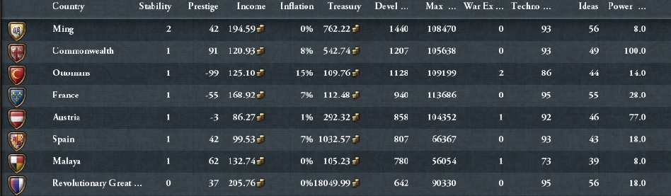 一番効率が良いのは、適度に領土を拡大して、君主点のあまりを農場地帯のプロビにつぎ込むことでしょうか。Developmentだけで国力を伸ばそうとしても微妙な感じ…。