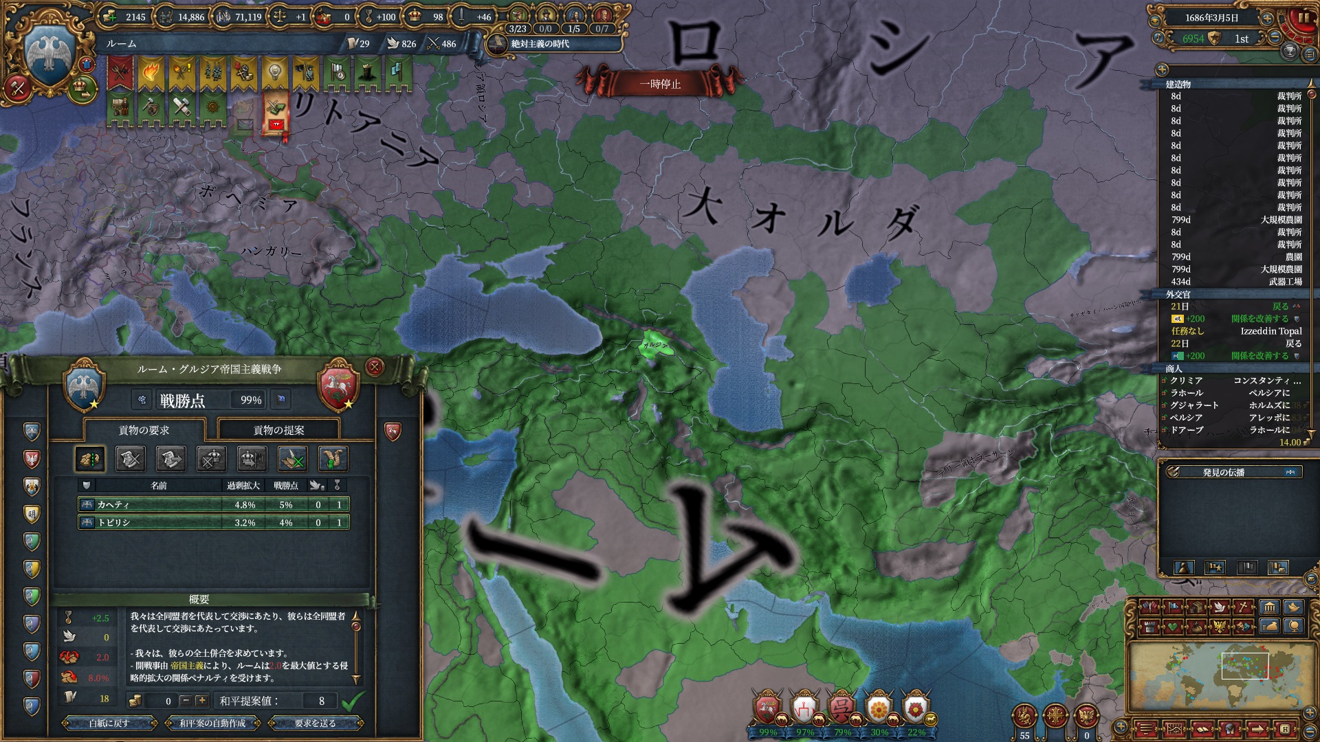 次からは高LV要塞を奪った州に建造するなどして遅延行為を狙って戦争を楽に進められるよう準備していきます。