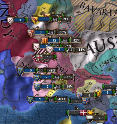 というのもフランスはこの時絶賛スイス戦中であり、北イタリアと中東で軍勢を操作してとても忙しかったようなのです