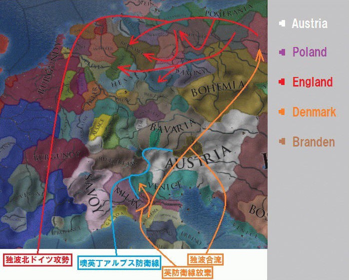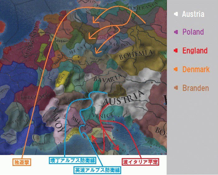 不意を突かれながらも三国の連携プレーでHRE軍を殲滅し、アルプスでは逆侵攻をかけました