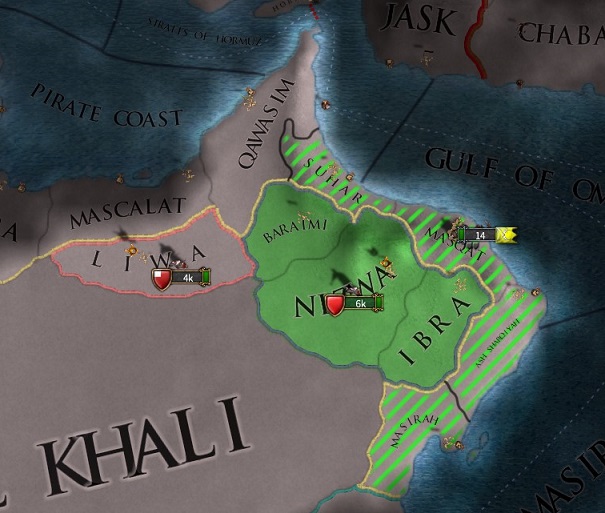 同盟国Dawasirが敵の同盟国Najdとの初戦に勝利、OmanもHormuzとの初戦に勝利し、マスカットの要塞には歩兵1ユニットを置きHormuzプロビを占領、海軍がなくHormuz首都には渡海できないため、Hormuz首都で徴兵される陸軍を適度に渡海、敗戦させつつNajd領の全占領に成功、マスカットの要塞を陥落させました。