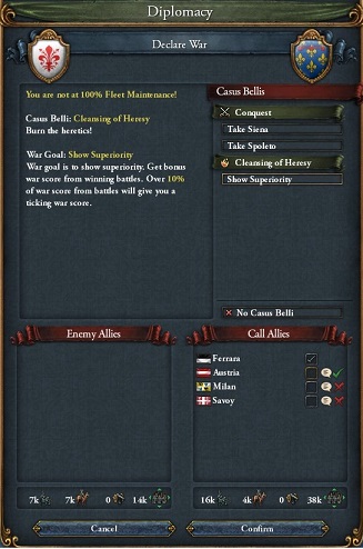 Milanに宣戦布告.敵同盟のAustriaとは一緒に対Castile戦を戦っているので,介入される心配はない.