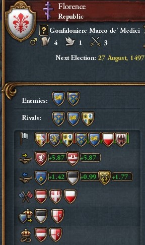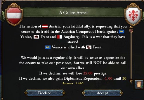 先の戦争でThe Papal Stateが弱体化→SienaがThe Papal Stateを殴る→NaplesがSienaを殴る,という流れでNaplesがFlorenceと隣接し,そのままFlorenceの領土を狙ってきたらしい.