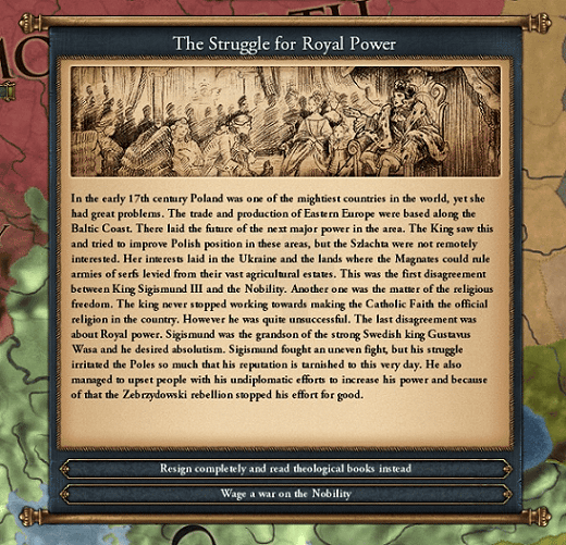 これはThe Struggle for Royal Powerのイベントで貴族に譲歩して貴族共和制になるか、貴族たちと闘って絶対王政を目指すかの選択肢で、忘れずに貴族たちと闘う選択肢を選ぶことだけですね。