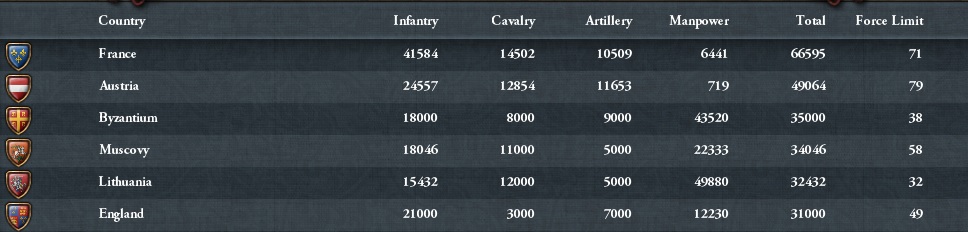 この2国を併合した時点で朕の帝国の常備軍は35連隊になったよー。地味に世界3位の陸軍国家だね。序盤のオスマンユニットの軍は脅威だけど、そろそろオスマン単体だったら単独でも戦えるかな?