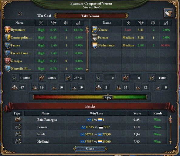 Basileus実績の総本山である対オスマン戦が最早講和内容以外全く説明されないとか泣けてくるねー。それじゃあ40連隊を西部国境に移動させヴェネツィアに宣戦布告だよー。