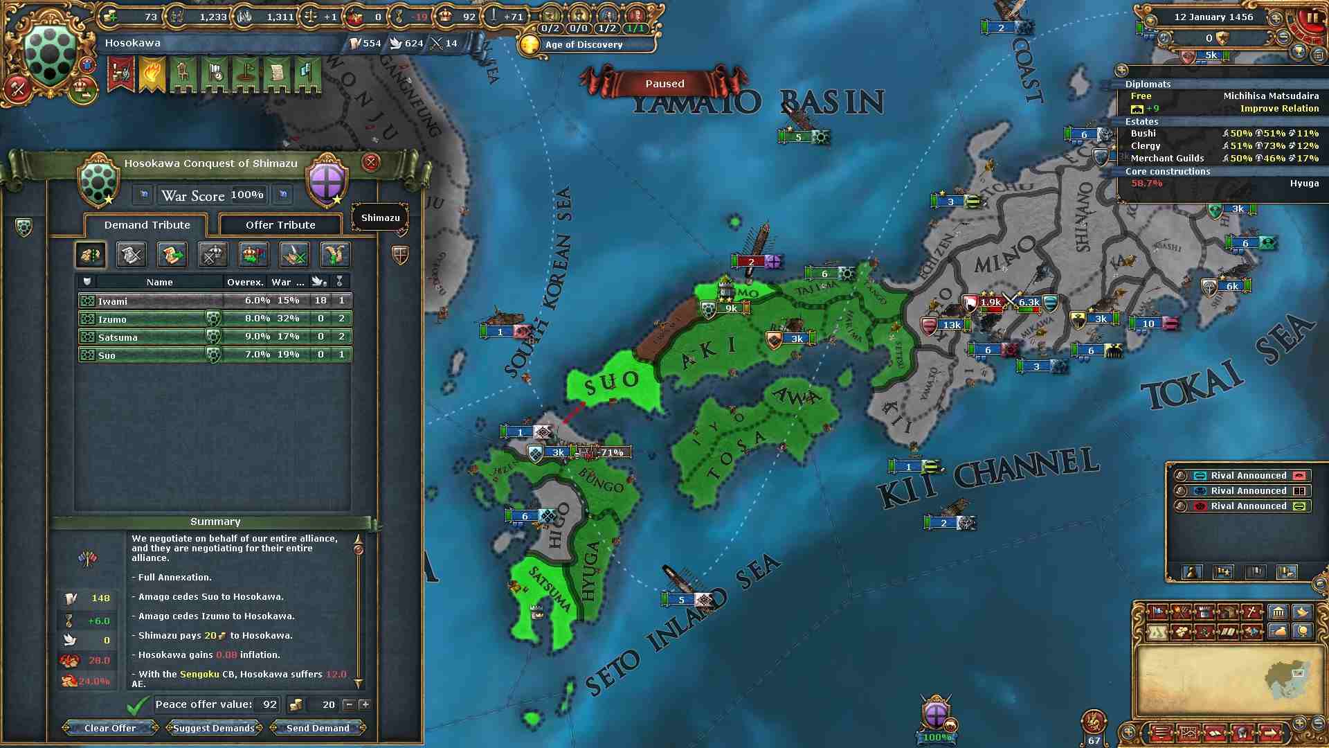 この時期の戦争では、個別和平での割譲や最初の山名戦以外はクレームのない州の割譲は行いません。