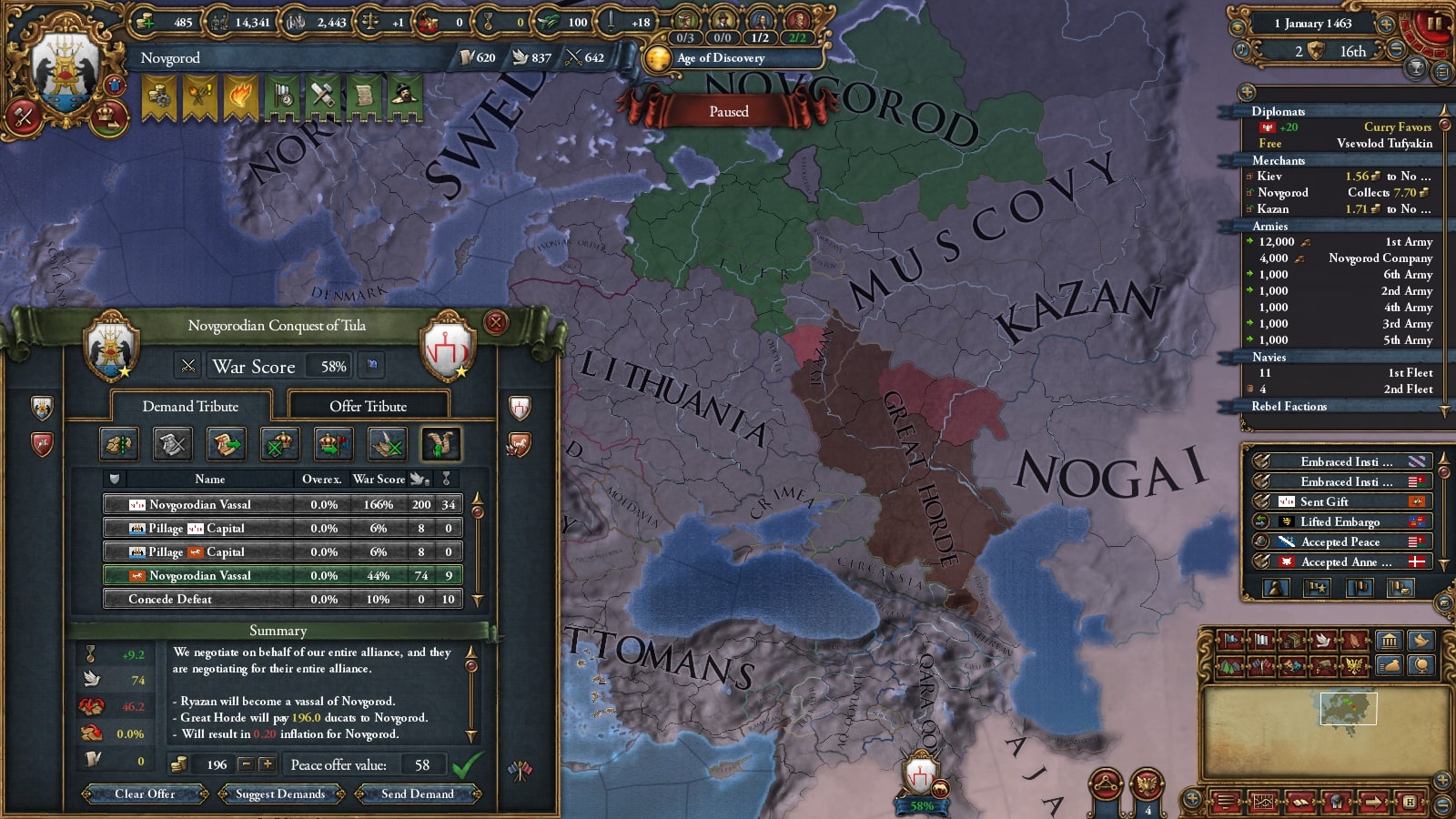 1466年、モスクワとの停戦が切れたので再びポーランドを連れて宣戦します。モスクワはノガイ・オルダ/Nogaiと同盟を結んでいるため、100点を求めるのは厳しそうです。