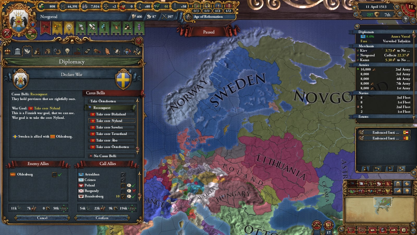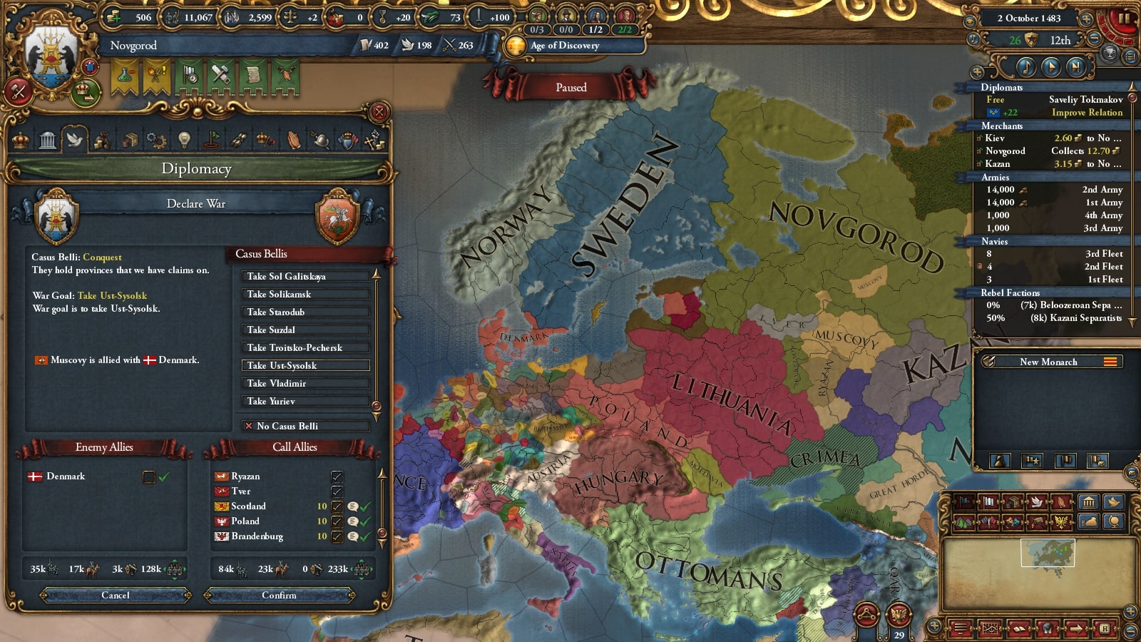 さて、国内の状況はかなり恵まれていますが、実際のところノヴゴロド公国はなかなか難易度の高い国家となります。理由はいたって簡単で、周辺国家のほうが国力が高いためです。カルマル同盟とモスクワという強大な国家に挟まれ、身動きを取ることができません。特にモスクワは大量の属国の影響で扶養限界/Force Limitが多く、単純な国力差以上の差が兵力に出てきます。AI国家は、史実でそうであったように、いつもモスクワに滅ぼされてしまいます。