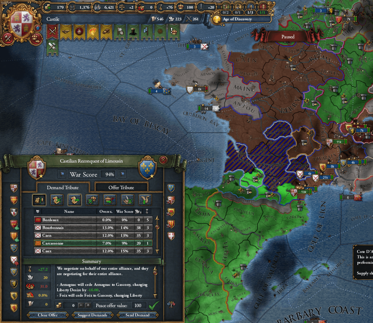 フランスにガスコーニュの再征服CBを用いて攻め込んでいます。同盟にはブルゴーニュを呼んでいます。