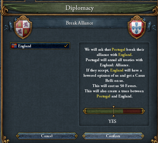 ポルトガルの好感度が50溜まったところで、ver1.31で追加された要素「同盟の破棄」によりイングランドとの同盟を破棄させました。この後、自身もポルトガルとの同盟を破棄します。