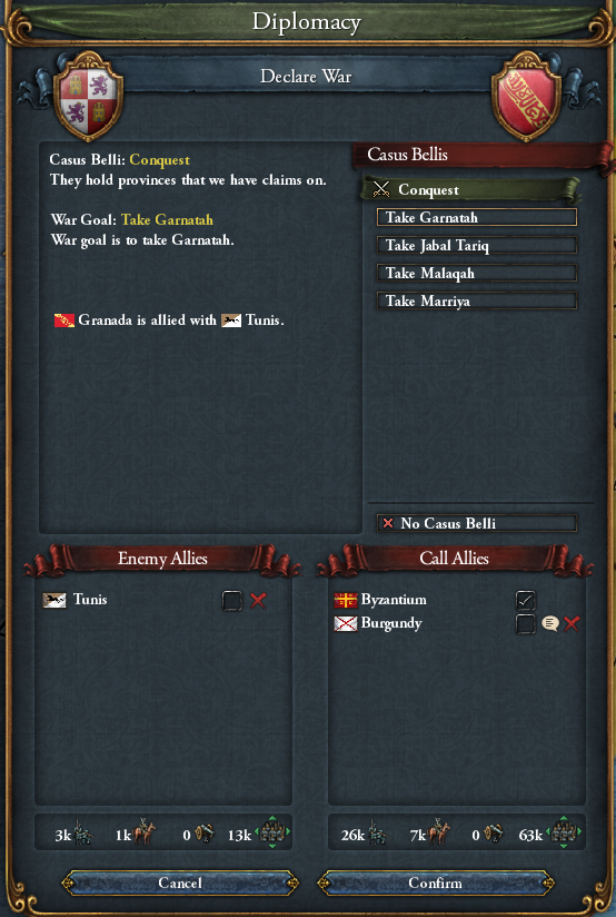 さぁ!最初の準備が完了したら早速やっていきましょう。まずは宿願であるレコンキスタを達成する為にグラナダを攻めたいところですが、ミッションを解放することでグラナダ全域の請求権がもらえます。