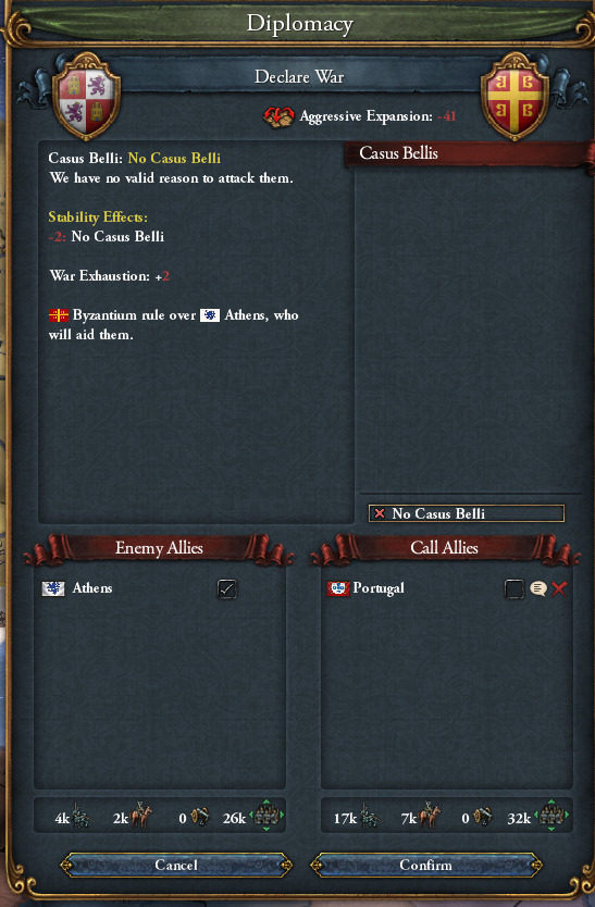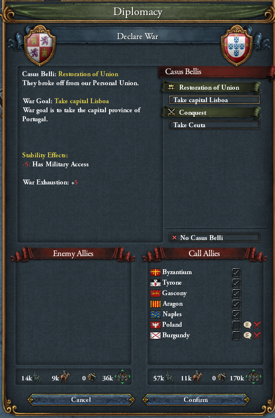 そしてポルトガルとの同盟破棄から5年後、ポルトガルへ「同君連合化」CBを用いて宣戦布告しました(軍事通行権を破棄してから宣戦しました)。