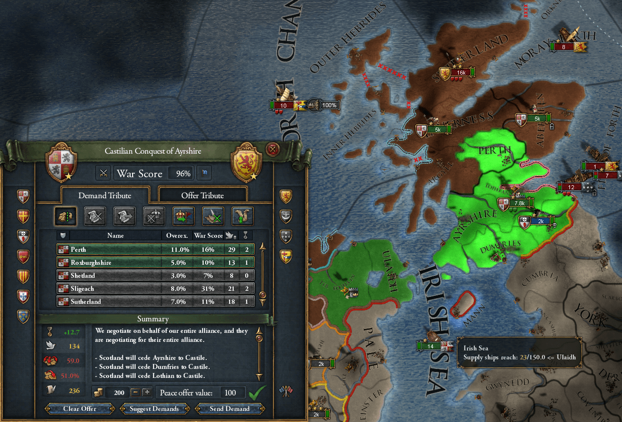 イングランドの拡大を防ぐため、先にスコットランドに宣戦しイングランドをふさぐように割譲しました。割譲した州は全てティローンに統治させます。