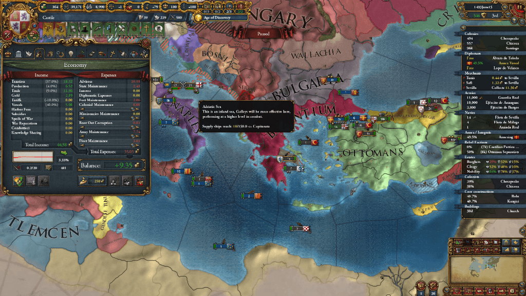 今後は、バルカン半島を起点として東へ東へと進んでいきます。まだ包囲網が怖いので、しばらくは再征服CBを用いた拡張をしていきます。