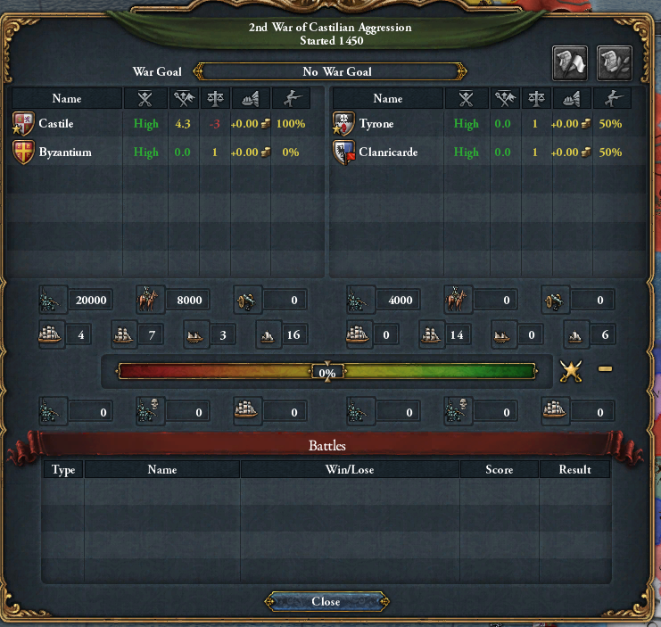 いずれ訪れる対イングランド戦の為の橋頭保として、アイルランドの小国ティローンにNoCBで宣戦しました。数多のイベントで安定度が既に-2だったため、安定度低下ももはや気になりません。イベリアの狂犬です。