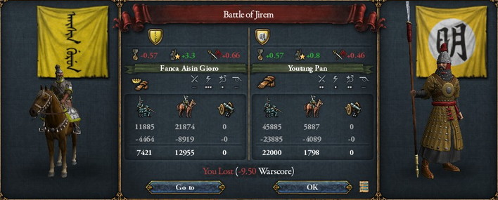 だが、満州軍の異常な強さ(discipline115と八旗)を前に、各地で徹底的に敗北し、将は討ち死に、一時は兵力の過半が消滅。