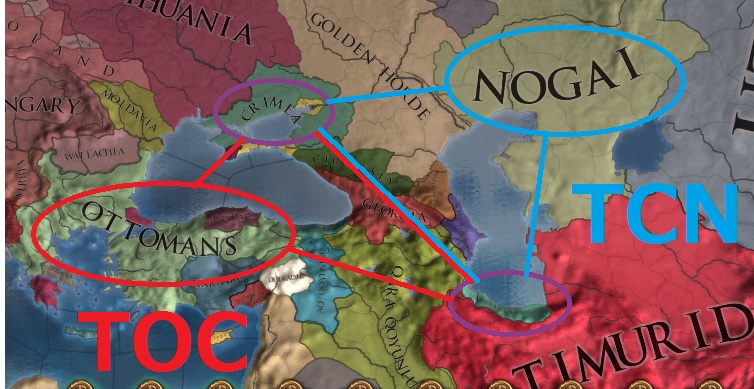 ここまでは君主が死ぬのと同盟締結どっちが早いかのスピード勝負!クリミア=ノガイは高確率で同盟してるからこれで強固な三カ国同盟が完成だよー。ここまでこれば少し肩の重荷を落とそう・・・。