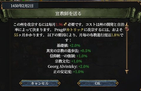 開始時点ではプラハはフス派なのでモニュメントを利用するのにカトリックに改宗しなければならないので、確保したあとはフス派の聖地補正の布教強度-5%を相殺するため布教強度を盛りカトリックに改宗させたあと、最大まで借金をし、「プラハの歴史地区」モニュメントに投資していきます。