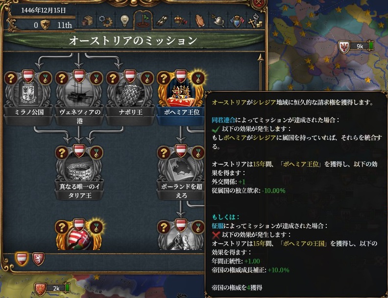 ボヘミアを同君にしたので、ミッションを達成し帝国権威4と外交評判独立欲求減を獲得