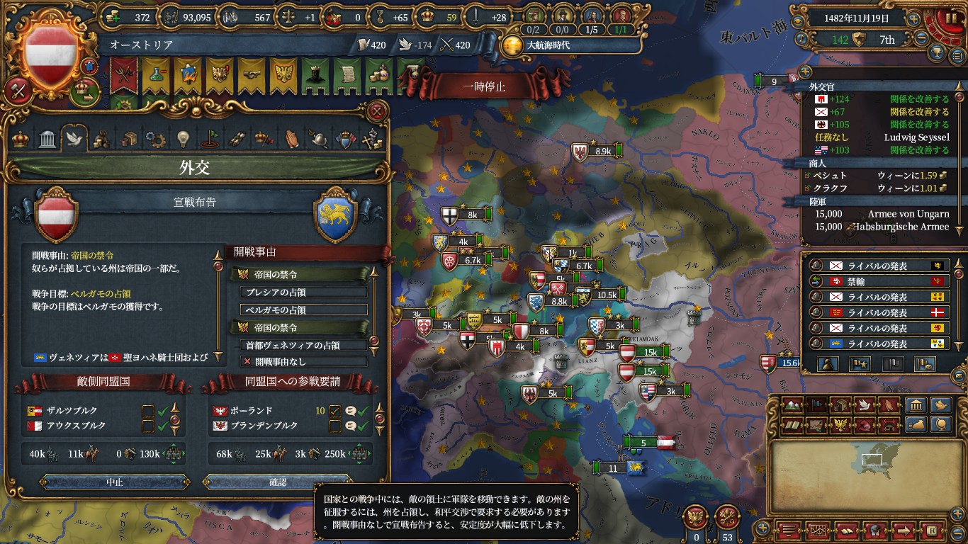 1.HREが平和状態(IA+0.1の補正がある)のときはなるべくHRE諸侯(敵同盟含み、ボヘミア除く)と戦争しない
