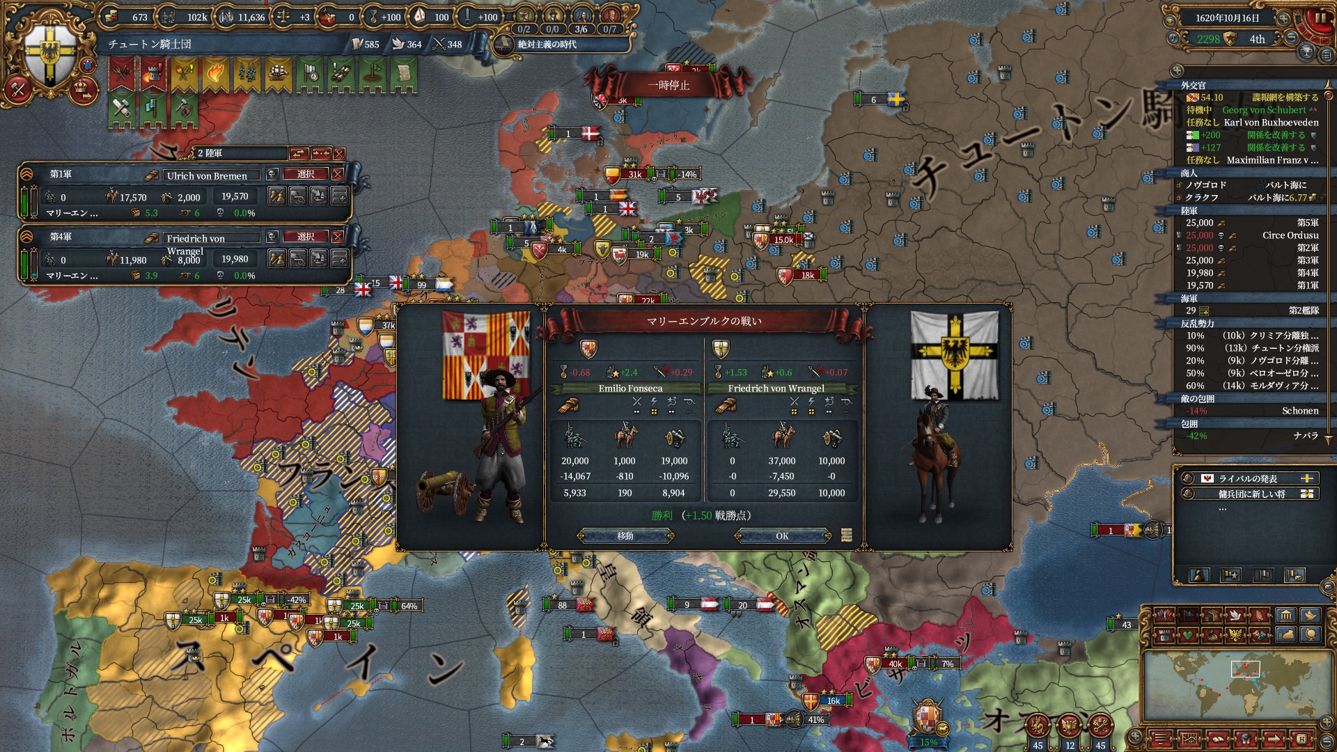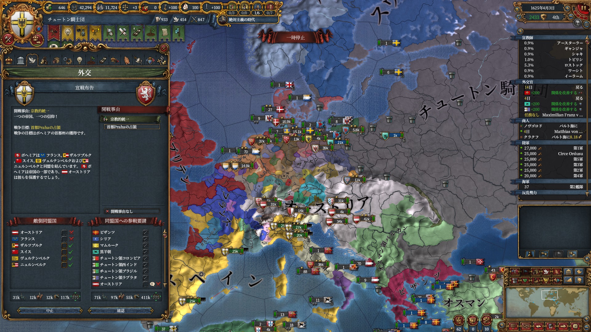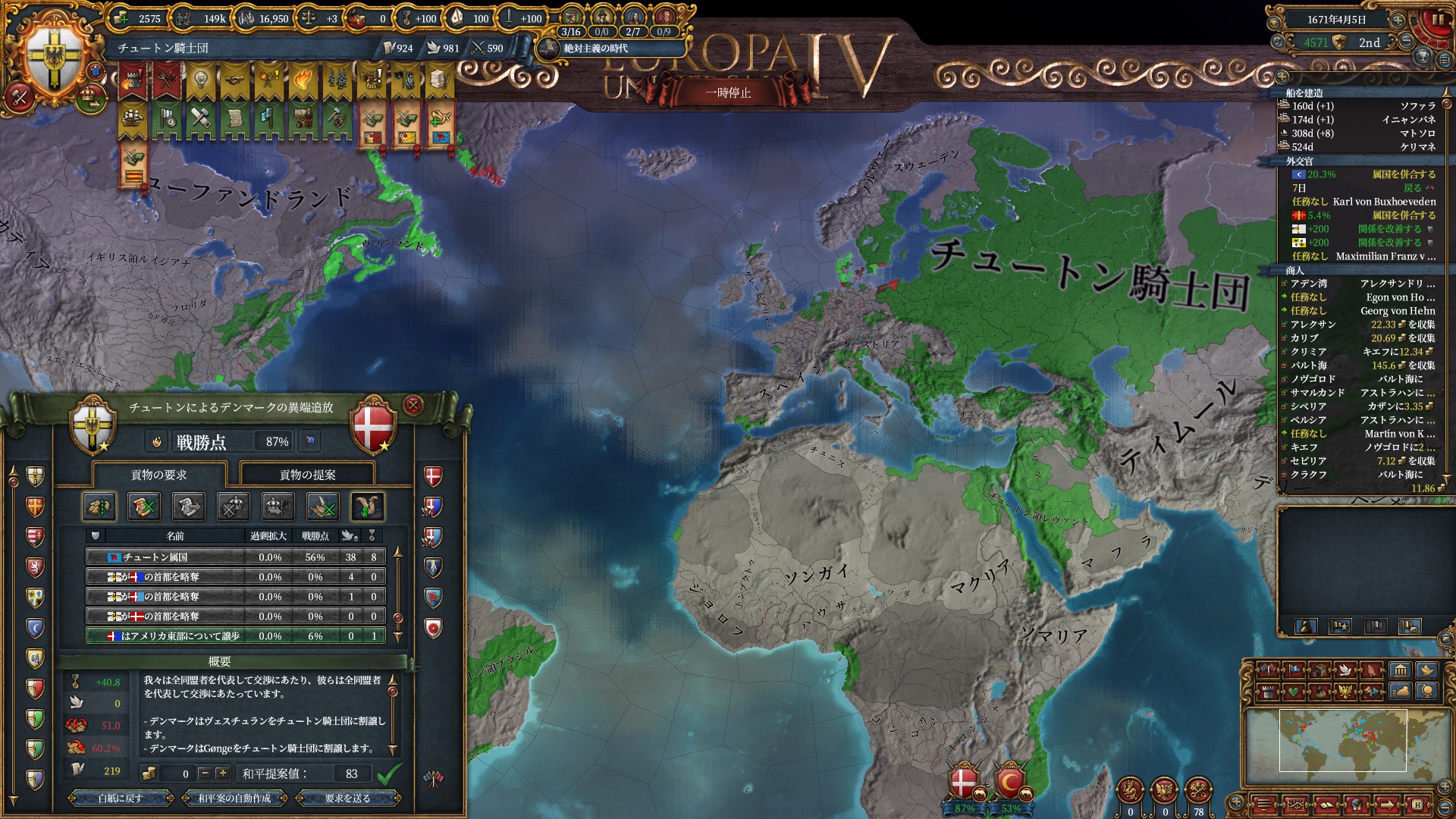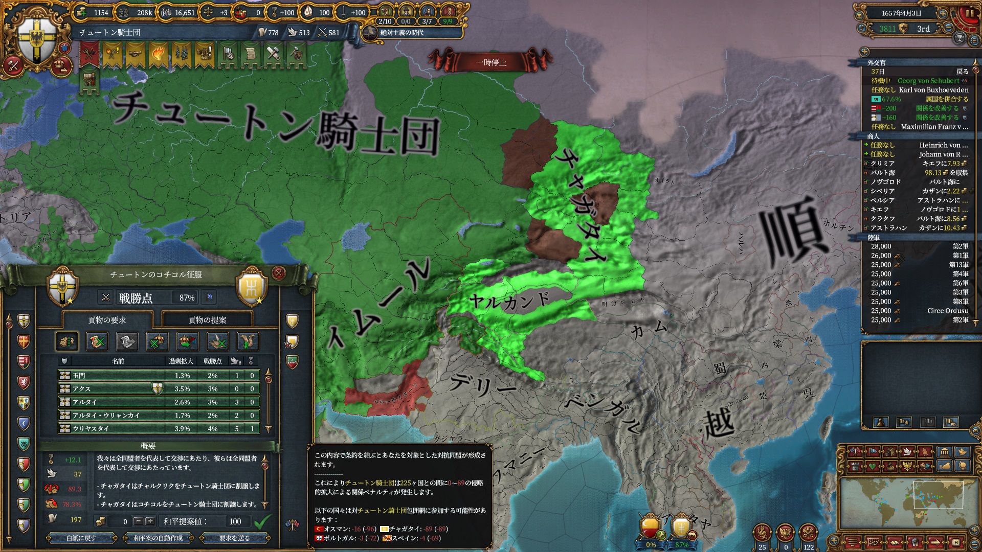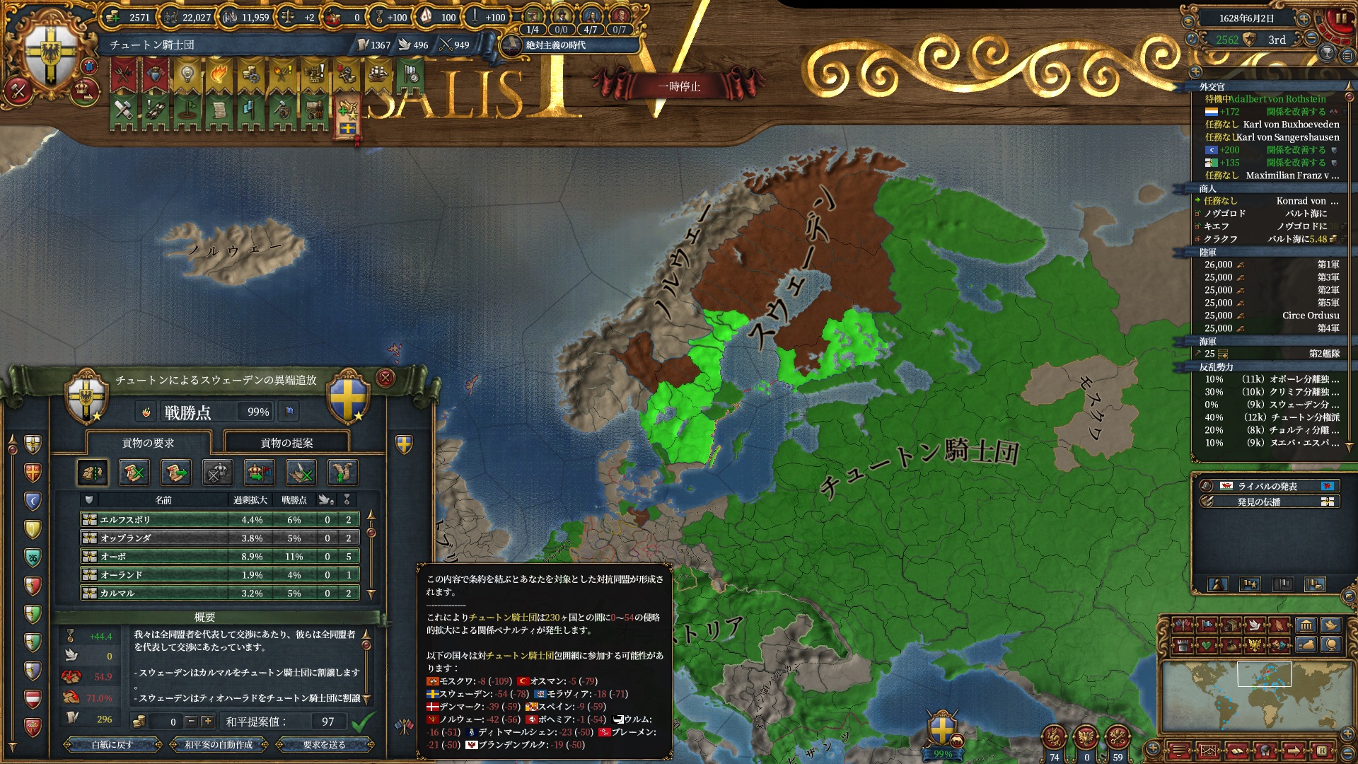 あとはOpinionが許す限り同盟を引っ張っていきますが、欧州のラスボス候補はもうおらず欧州外は宗教が異なるため一瞬で刈り取れ、少なくとも世界征服は当確といっていいでしょう。