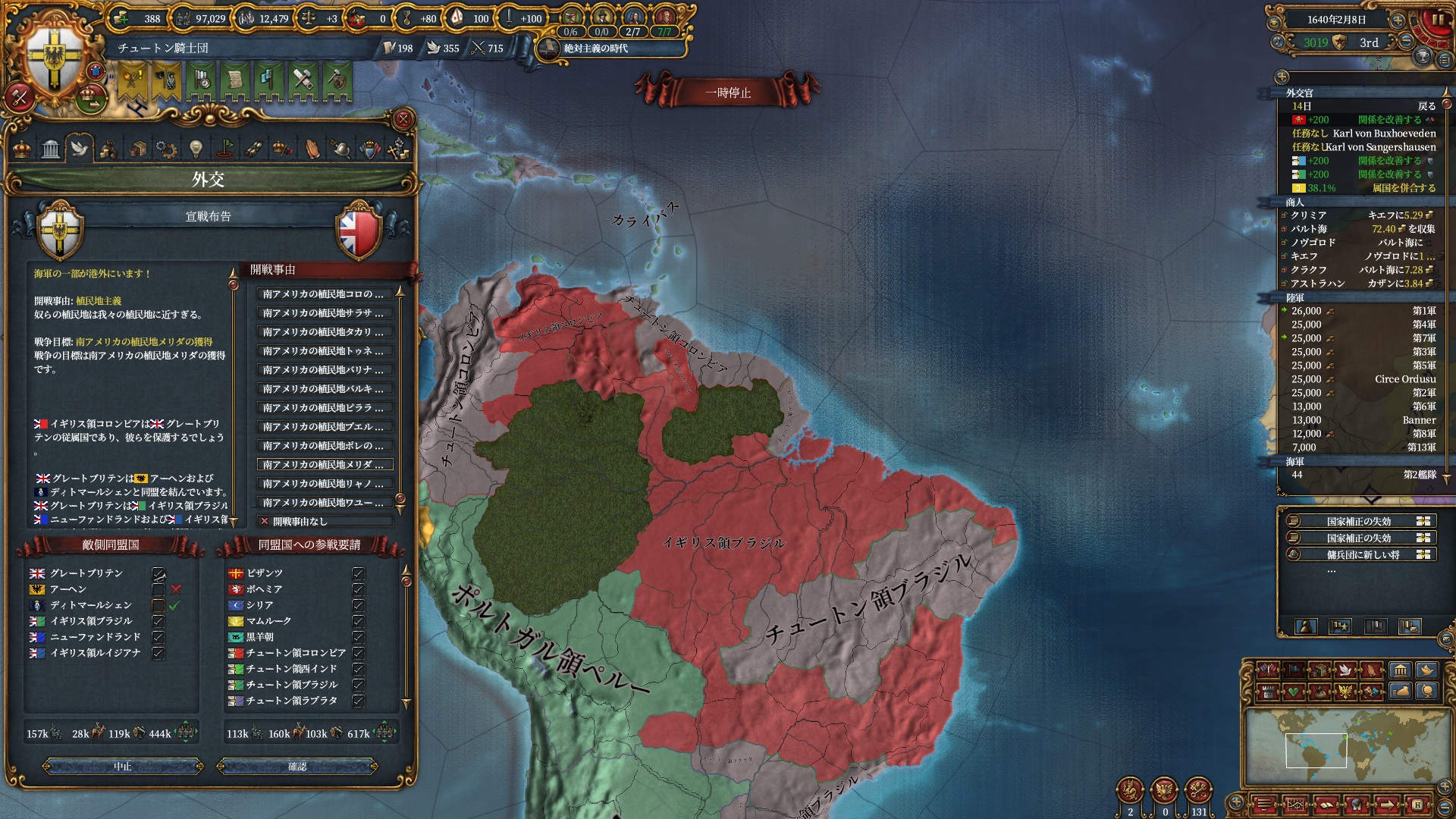 植民地国家持ちはその軍量から包囲網に入りやすく、逆にこちらの新大陸の支配域が広がるほど包囲網を無視した動きがしやすくなるので、そういった意味でも新大陸の平定は大事です。