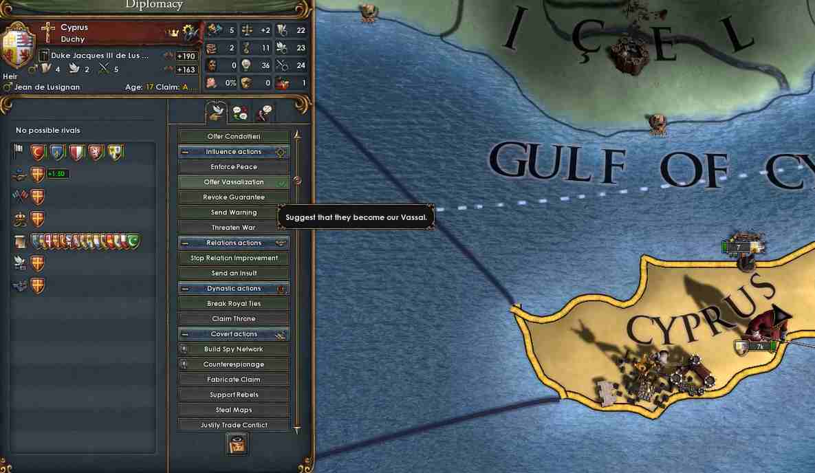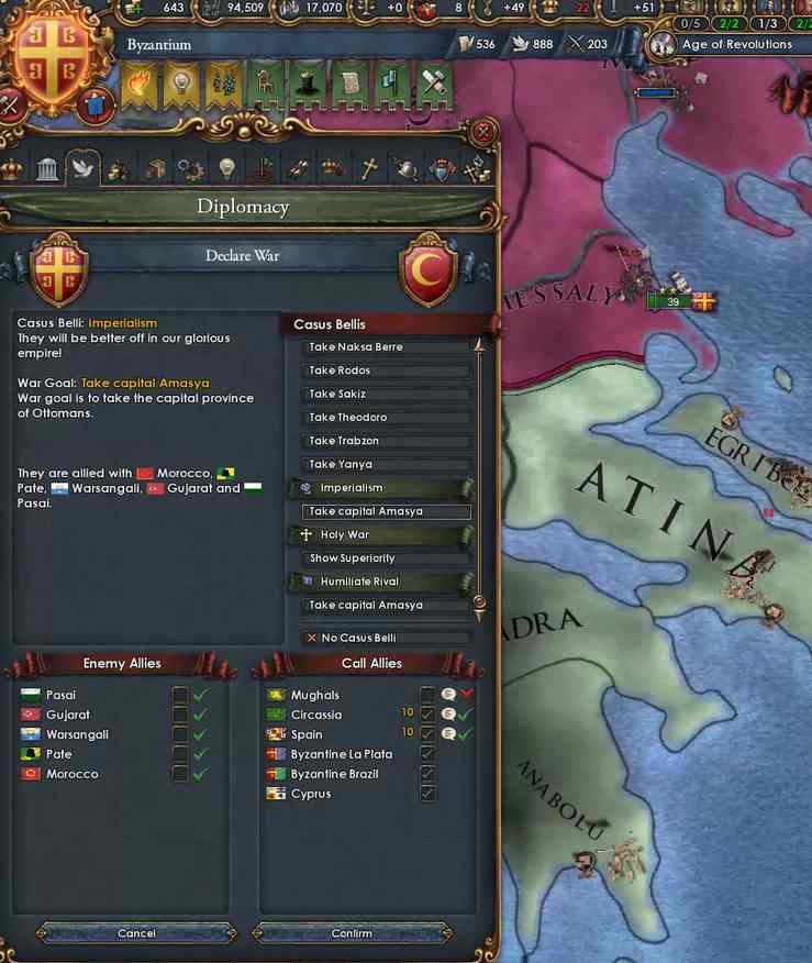 とりあえず、Basileusで必要なので戦争の前にキプロスと同盟して外交属国化。あとで併合します。これによりBasileusに必要なプロビは現時点ではすべてオスマン(とビザンツ)が持っていることになるので、とりあえず複数の大国を相手に戦争する状況にはならなそうです。