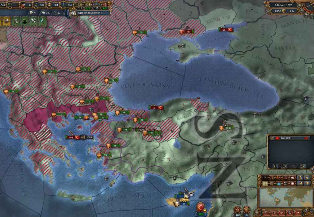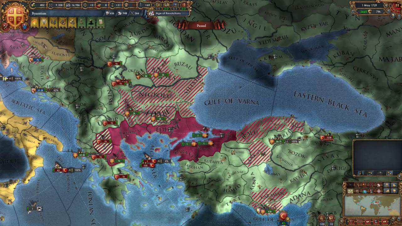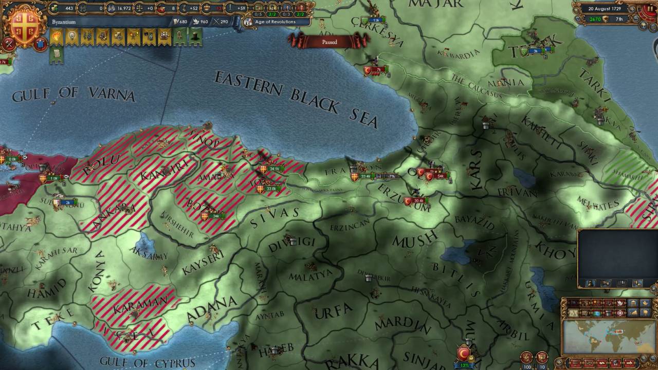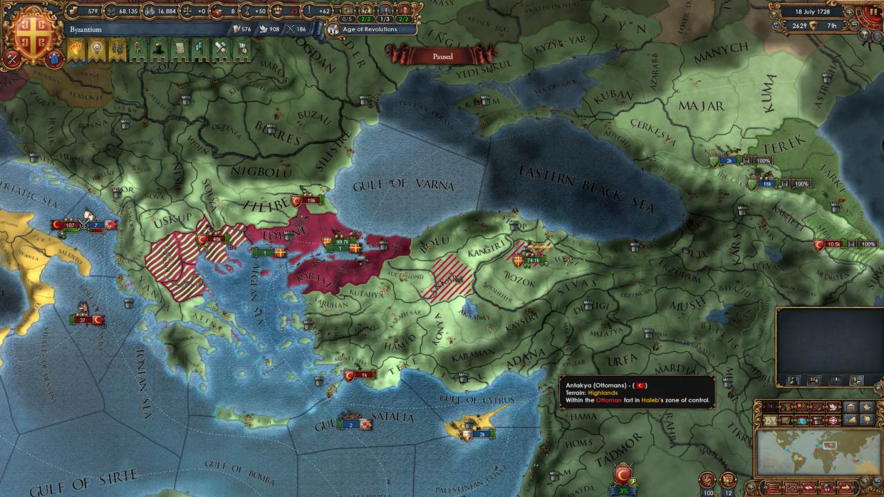 これ、Basileusの実績を獲得するうえではかなり重要な要素で、クリミア半島はゲーム中は基本的にロシアの勢力圏にあります*3から、ここを取るということはロシアと敵対化する可能性がかなり大きくなります。また、状況によってはすでにオスマンがクリミア半島をロシアに奪われていることもあり、その場合にはオスマンとロシアの2大国を相手にしなくてはなりません。こうなると難易度は大きく上昇します。