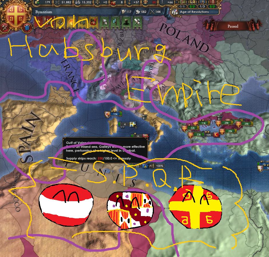 あれ?スペインはイタリア半島を持ってるしビザンツは元の東ローマ帝国の姿に戻りつつある、オーストリアは西ローマ帝国の末裔こと神聖ローマ帝国の元君主・・・ってことは