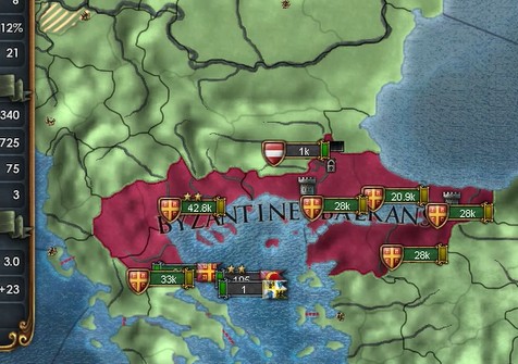 そうこうしているうちにバルカン半島側ではビザンツによる占領が進みます。ぽこぽこオスマン軍が現地徴集していますがなんの力にもなっていません。