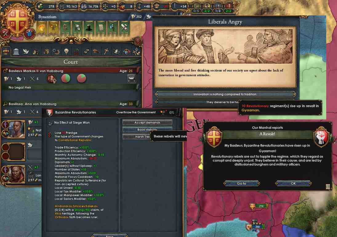 イベントでStabilityが下がったらトリガー引いちゃった。今回はイベントではなくDisasterによる革命で、これを起こすとなかなか大変なことになります。起こそうと思えば起こせたがさすがにこんなことをやって今までの努力をおじゃんにしたら何も言えないので今回は革命無しの方針で。後から考えたら革命を起こしてもロールプレイ的にはよかったかなと。ビザンツの旗がどうなるのかも結構気になるし