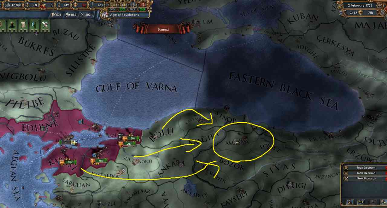 オスマンの首都はアナトリアの内陸のほうのAmasyaに移ったため、そこを占領しに行きましょう。