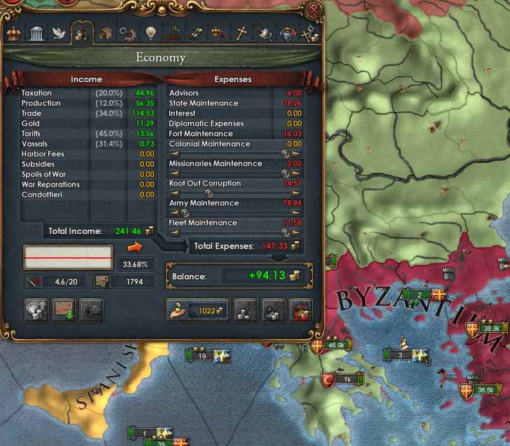 (トーレドによる収入に注目。第一次対オスマン戦争の前はトレード収入は57.27だった*18が、今回の戦争ののちに114.53まで伸びた。爆上がりだがまだまだ陸軍維持費を最低にしないとつらい)