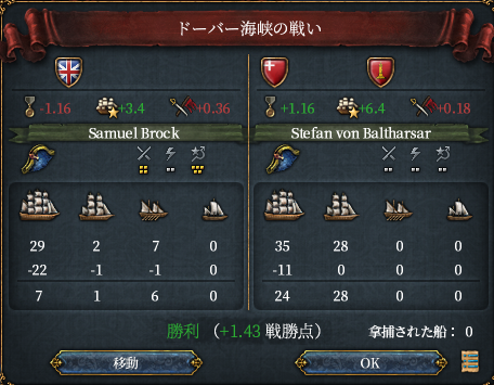 ところで、この世界のグレートブリテンは元気がなく、フランスに宣戦されてスコットランドを削るも巨大化したフランス+アラゴンが上陸してスコットランド領回復のパターンを数回繰り返していた(途中なんとかグレートブリテンになれた)。植民もメキシコ北部にかろうじて行っている程度で決して強国とはいえない。したがって大型船の数も30隻程度である。海軍軍質に勝る大量のスイスの大型船で叩き潰してもいいがそれだと質強化があまり見れないと思われたためあえて大型船33(+属国2)隻+小型船で挑むことにした。