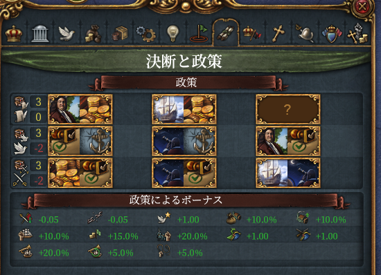 ちなみに宗教をとっているとDIPポリシー宗教+海運で海軍士気と海軍士気回復速度を10%上げられる。MILポリシー宗教+海軍で提督白兵+1、船舶喪失士気低下-10%も出せる。ただ宗教アイディアにそれ以外の出番があまりなさそうだったためやめた。またDLC不足から旗艦は存在しない。