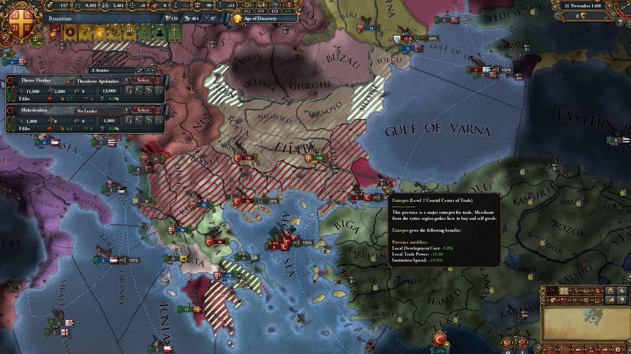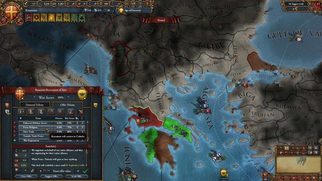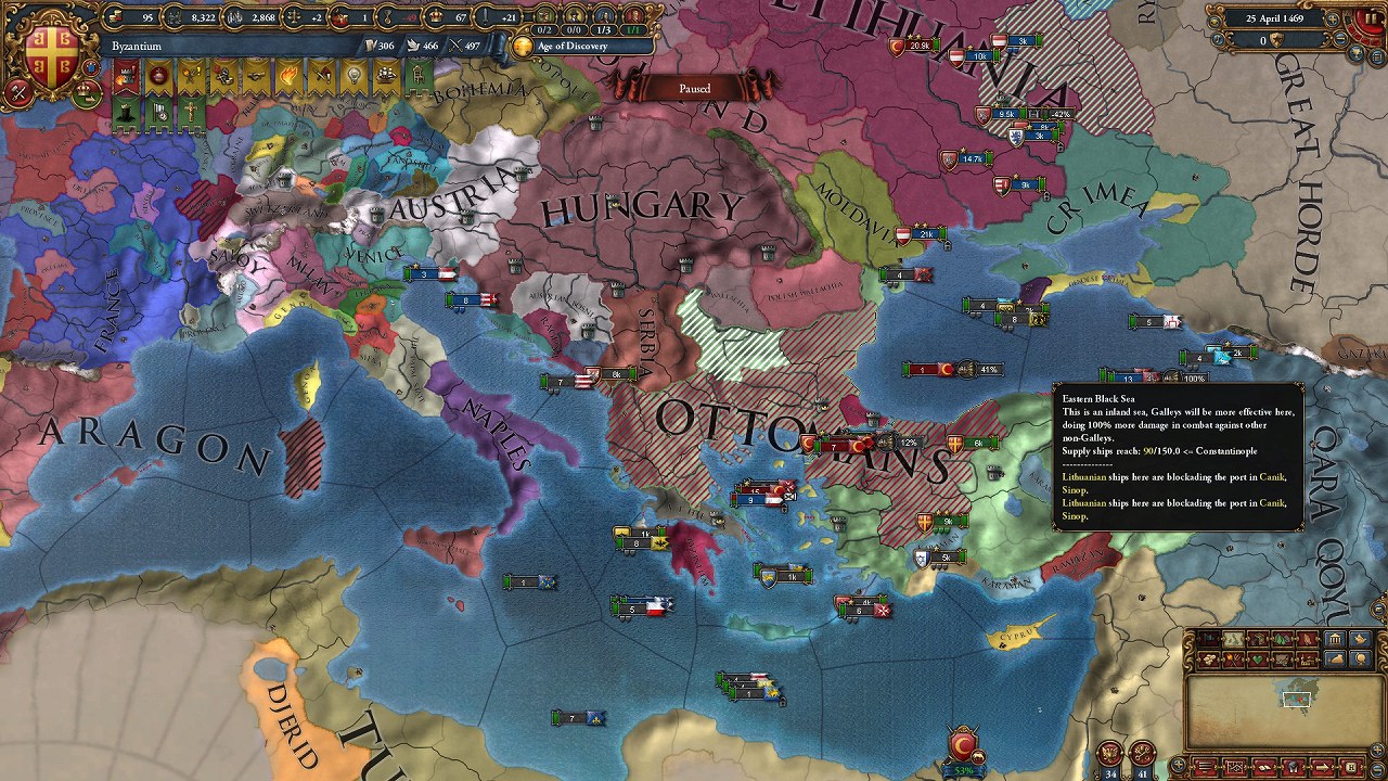 画像はビザンツのFLが14、同盟はオーストリアとリトアニア、オーストリア-ハンガリーの同君連合が成立しており、オスマンがマムルークと戦争している状況です。リサイズにより見づらくなっていますが、戦力はビザンツ側が歩兵71K騎兵14K、オスマン側が歩兵38K騎兵7Kです。これくらいあると非常に理想的ですが、オーストリアがフランスと戦争をおっぱじめたりオスマンがなかなか他国と戦争を始めなかったりして開戦時期が後ろにずれ込むことがよくあります。その時はアイルランドやスコットランドの侵略を進めたり別の国にNO CBして拡張したりしましょう。もしかしたら1500年代までかかるかもしれませんが、その時はExplorationで西アフリカに行ったりしてもいいかもしれません。アイルランドから行くにはDipTec7必要ですが。
