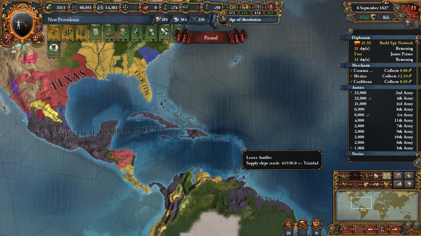 中でもポルトガルは時代ボーナスや立地で圧倒的な植民力を誇り、またついでに解除できる実績が2つ*4もあるが、純粋に海賊プレイのことを考えるならあまりお勧めできない。