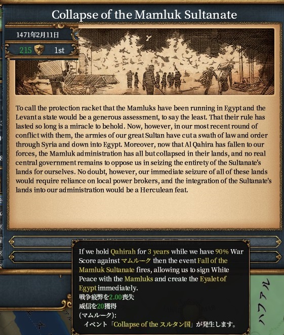 白洋から得たマシュリク地域の州と合わせて6州になったのでマムルークの打倒ミッションが達成できます。