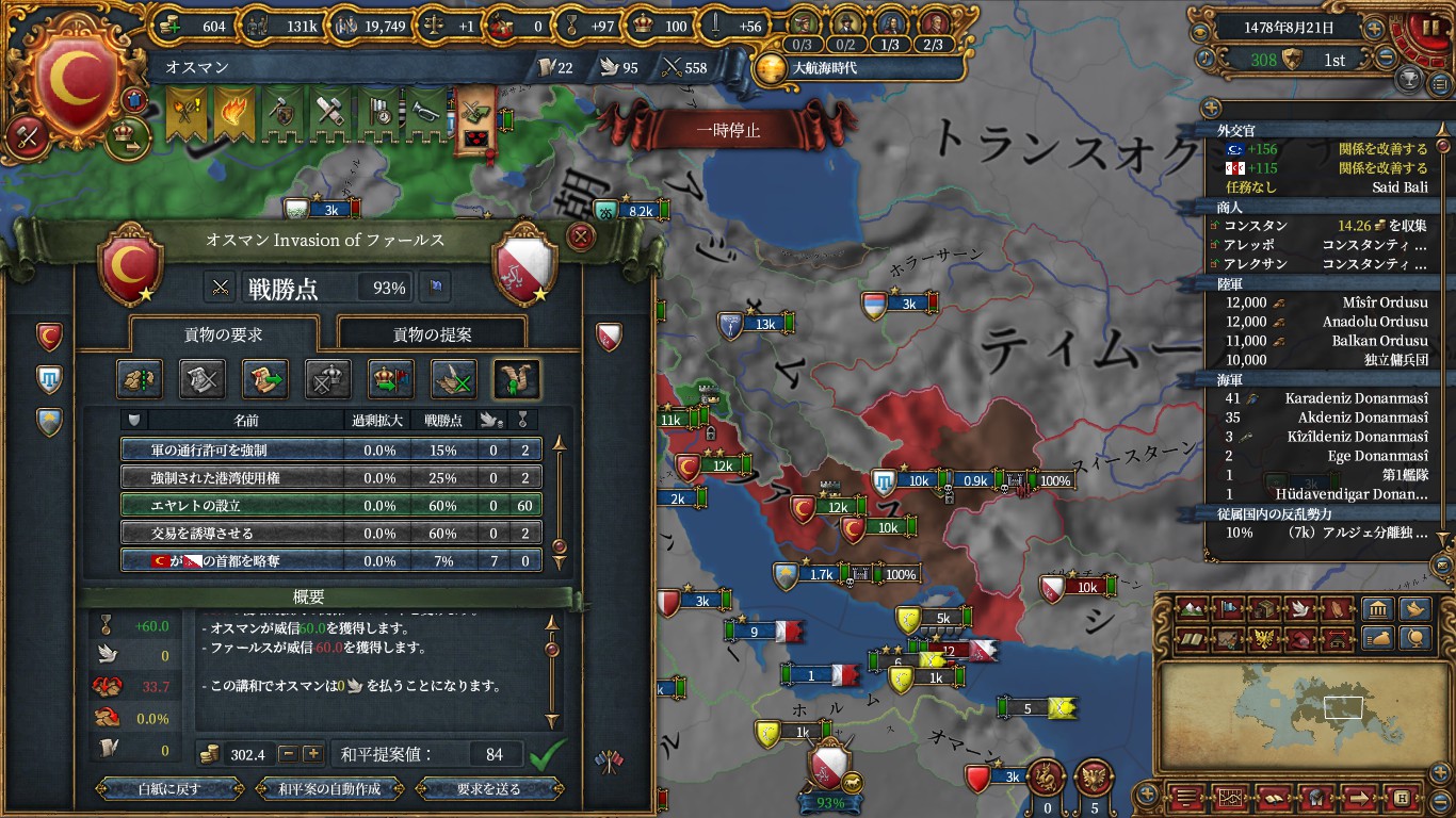 ミッション報酬で得たチュニスエヤレト化cbでチュニスエヤレト化後、アナトリアのアジア部分に遷都。交易首都はコンスタンティノープルノードに。