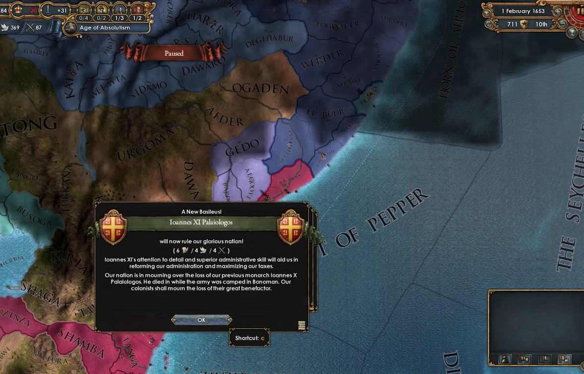 1653年、Ioannes10世(3/2/5)が崩御し、Ioannes11世(6/4/4)が即位。文句なしの高能力君主で当然ながら今回のプレイにおいては君主点的には最優秀でした。