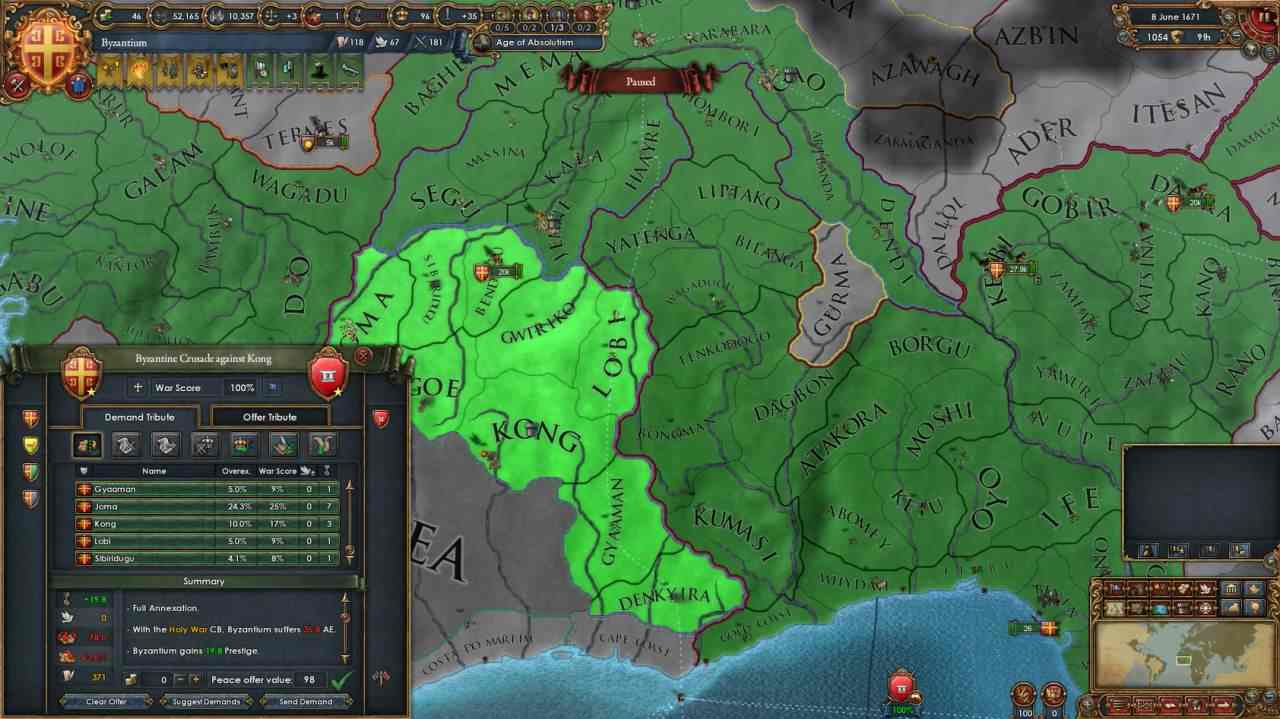 さらに、西南アフリカに存在していた「コンゴ国」にも領土を広げた。この地域の国と東ローマ帝国との関係はもともと悪く、「Ioanness8世の聖遷」*7の直後に領土の拡大を模索していた東ローマ帝国に危機感を抱き、西アフリカ諸国と同盟を結ぶことでその勢力を抑えようとしていたようだが、聖遷から200年弱を経て強大化した東ローマに対抗できる手段を持ち合わせなかったため容易に征服された。しかし、コンゴ国はイスラーム教の勢力下ではなく宗教としての体系が明確ではない呪術信仰*8の国であったため、長い歴史を持つ正教が広まるのは極めて早く、現地住民は征服というよりも文明国のローマ帝国に組み込まれたとの印象を受けているようで、それほど大きな反乱は起きなかった。