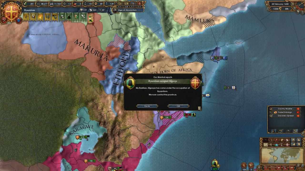 また、Absolutismもどうにかこうにか60付近まで伸ばし*26、ロシアとも同盟を結び、スペイン-ロシア-ビザンツでオスマン包囲網を作ってオスマンとの最終決戦に備えます。